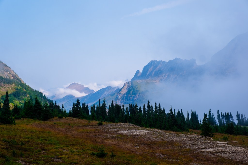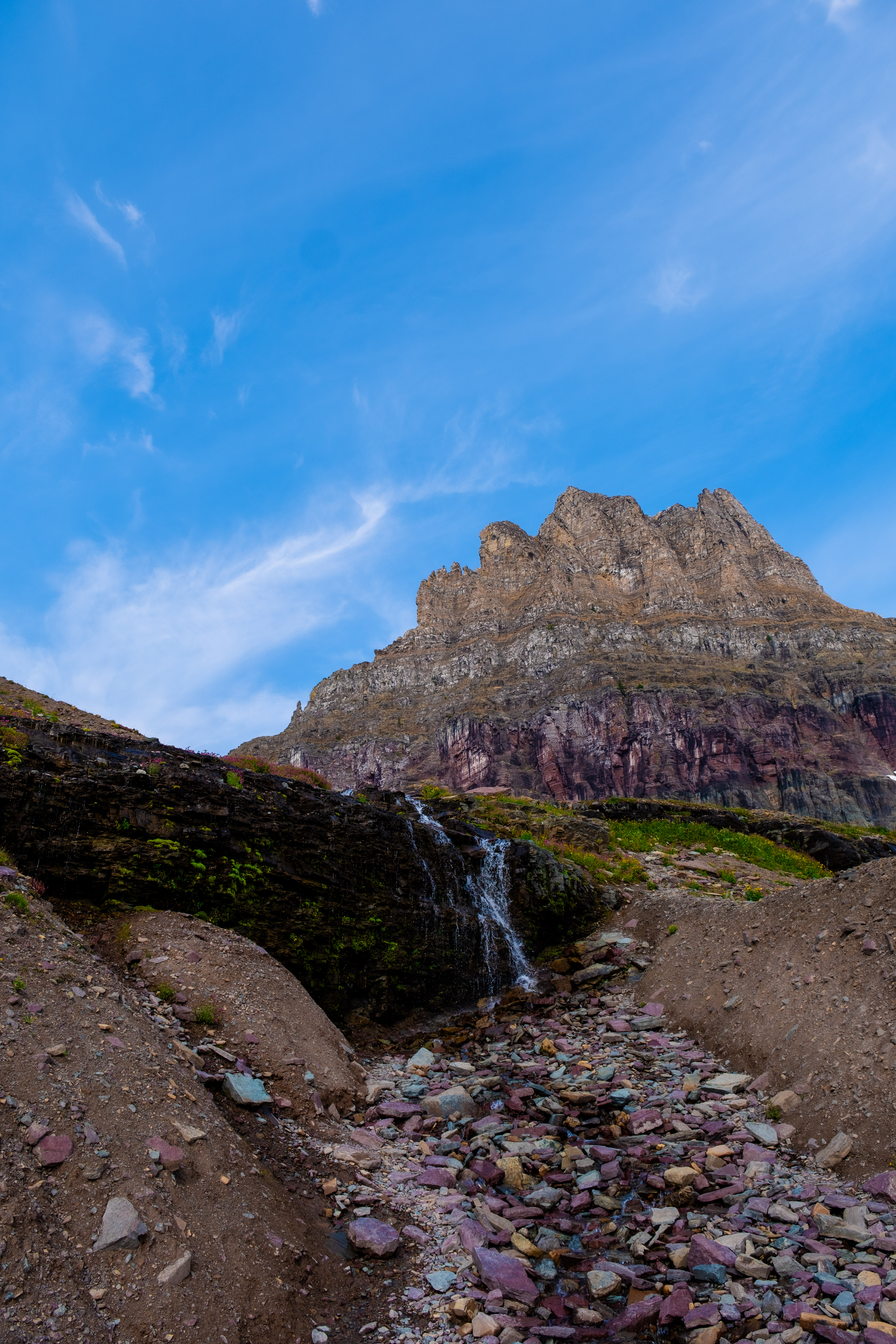 Dus we rijden van Waterton NP naar Glacier NP en onderweg bezoeken we de Red Canyon en steken we de grens van Canada naar de US weer over. Ik vraag me serieus af, moet je om bij de douane te mogen wat knorrig zijn? We laten het maar gaan en rijden de USA in. We lunchen in de camper met een prachtig uitzicht over de gletsjer. We hebben een tijdslot om bepaalde wegen te mogen rijden, en rijden daarom de route van de vele gletsjers, stappen soms uit en kijken rond. De weg begint met heerlijk asfalt maar gaat al snel over in gravel, dus we hobbelen en klotsen naar de andere kant.
